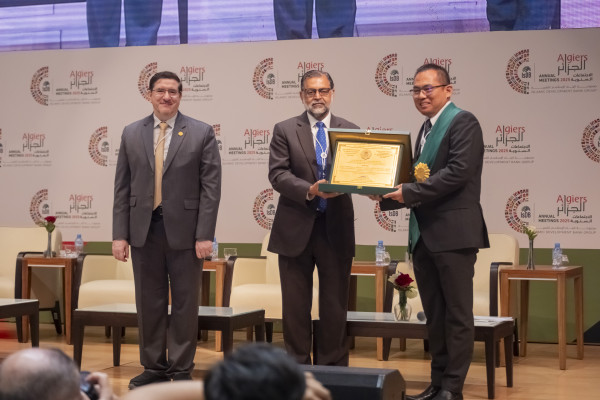 IsDB Vice President (Finance) and CFO, Dr. Zamir Iqbal, presented the first-place prize award to Mr. Afdhal Aliasar, the team leader of Medikids project, during the 19th IsDB Global Forum on Islamic Finance, held as part of the Annual Meetings in Algiers. The third winner, Mr. Salah El Sadi, Founder & CEO, Blue Filter, was unable to attend the ceremony. The awards also included cash prizes of US$ 100,000 for the first-place winner, and US$ 30,000 for the third-place winner.