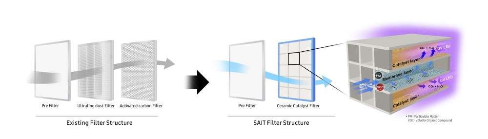 To tackle these challenges, Samsung’s researchers at the Samsung Advanced Institute of Technology (SAIT) developed and introduced an unprecedented filter technology that applies photocatalysts such as copper oxide (Cu2O) and titanium dioxide (TiO2) for the first time. The Samsung ceramic catalyst filter technology is expected to help create compact air purification systems, significantly reducing both disposable waste and the cost burden caused by frequent filter replacement.